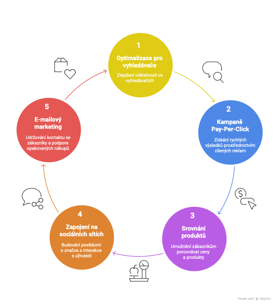 Sociálne siete a PPC zaistia viditeľnosť produktov → tovarové porovnávače ich predajú