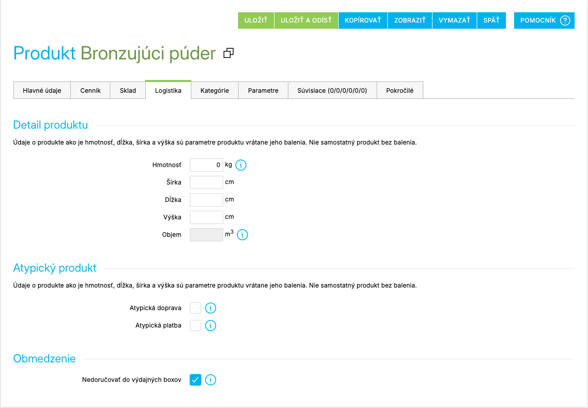 Nastavenie nájdete na záložke Logistika na detaile produktu. Je vhodné napr. pre produkty, ktoré sú ľahké, ale do boxu sa nezmestia. Pri partnerských doplnkoch, ktoré ponúkajú boxy vo svojich widgetoch, je nutná implementácia zo strany partnera. Môže sa tak stať, že tento druh widgetu bude stále ponúkať možnosť zvolenia boxu. Pokiaľ máte nasadené svoje vlastné úpravy, informáciu o nedostupnosti doručenia do boxu nájdete v dátach košíka.
