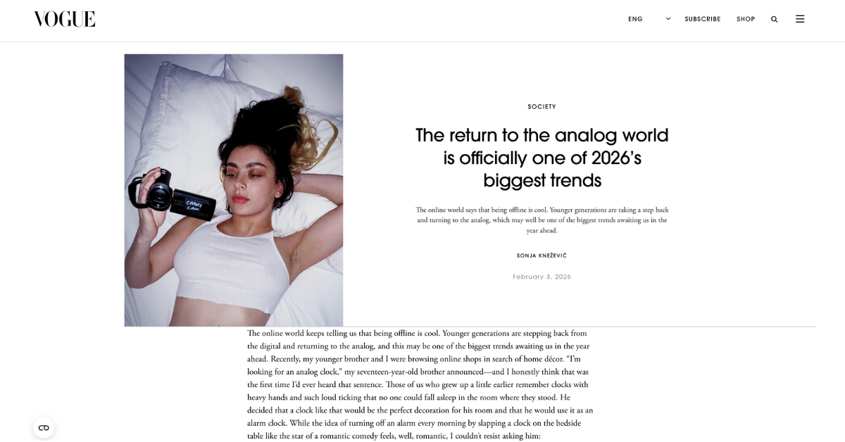 Trend reporty pre rok 2026 ukazujú, že ľudia hľadajú únik z digitálneho hluku. Čoraz viac sa obracajú k aktivitám, ktoré im umožňujú zapojiť zmysly a zažiť niečo skutočné. Ako jeden z najvýraznejších trendov u generácie Z to spomína aj VOGUE.