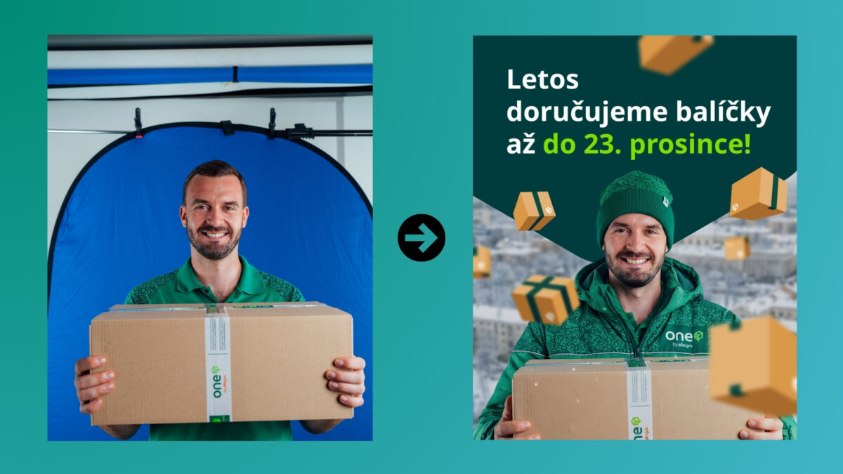 Pred Vianocami sme narýchlo potrebovali fotku kuriéra v zimnom oblečení, no žiadnu sme nemali k dispozícii. Využili sme preto Nano Banana Pro a počas pár minút sme si obrázok vygenerovali (ostatné prvky sú už práca grafika):